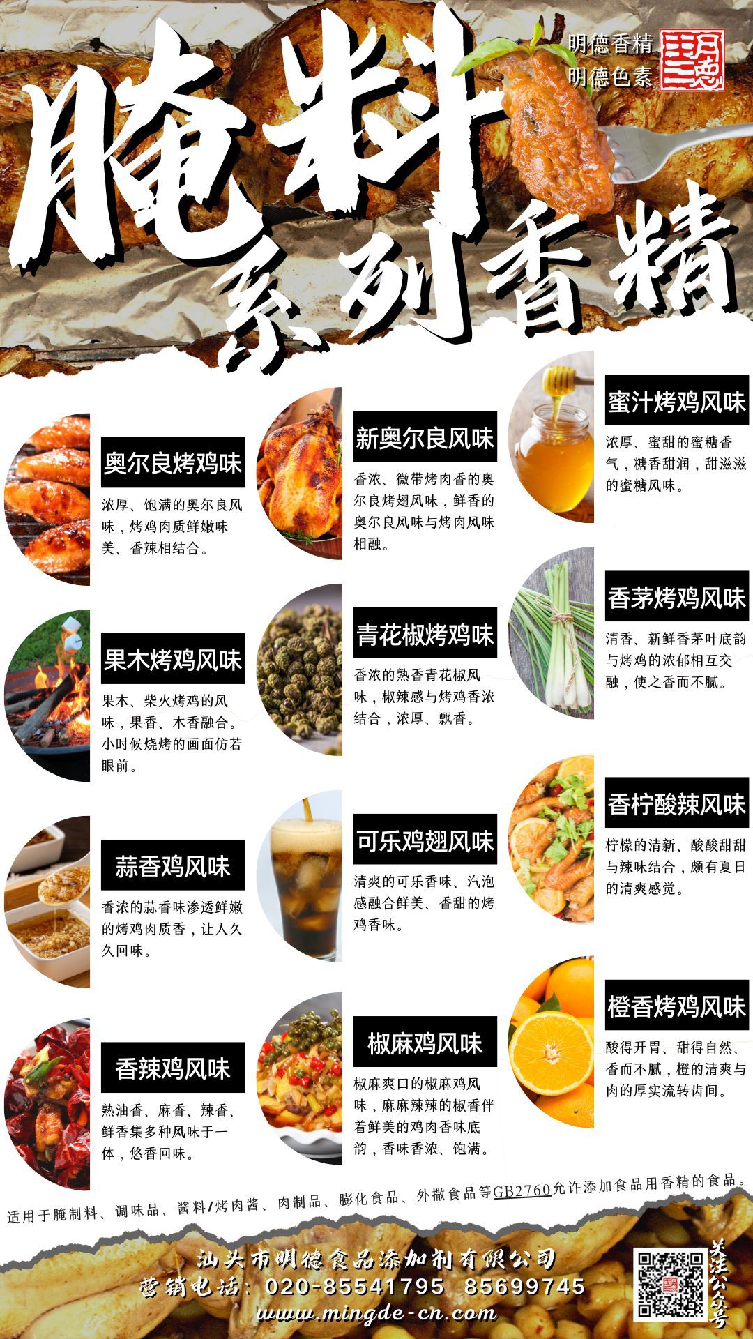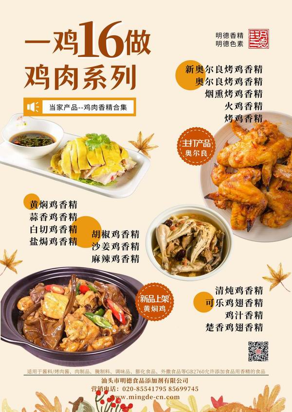 在雞肉香精領(lǐng)域我們潛心專(zhuān)研,結合市場(chǎng)潮流,消費者喜好,汕頭市明德食品添加劑有限公司現有以下16種雞肉相關(guān)風(fēng)味的香精,供您選擇。并持續努力研發(fā)更多符合市場(chǎng)需求的風(fēng)味。